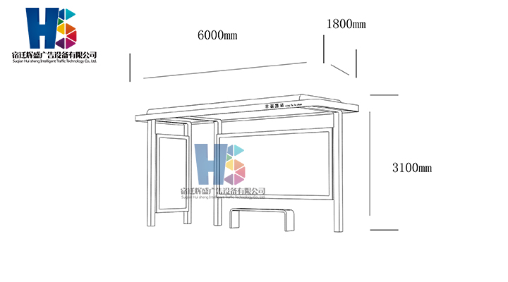 產(chǎn)品外觀 / PRODUCT DETAILS 產(chǎn)品信息 / PRODUCT INFO 【產(chǎn)品名稱】:新款候車亭HS60 【產(chǎn)品系列】:新款候車亭 【產(chǎn)品型號】:HS60 【產(chǎn)品規(guī)格】:長6000mm 寬1800mm 高3100mm 【產(chǎn)品材質(zhì)】:熱鍍鋅鋼板 【使用年限】:10-15年 【詳情致電】:181-5189-0417、157-5170-8886 備注:產(chǎn)品可根據(jù)用戶需求選用材質(zhì)、顏色及配件,個(gè)性化定制。 1、表面采用靜電噴塑(氟碳烤漆/搪瓷處理) 2、頂棚采用100*100*1.5mm、100*150*2mm鍍鋅管,3mm鍍鋅板激光切割件、1.5mm鍍鋅板焊接骨架,鋪1mm鍍鋅板(10mm陽光板) 3、立柱采用150*150*3mm鍍鋅管 4、箱體采用1.5mm鍍鋅板折彎焊接成型,門框采用全玻鋁合金型材,視窗采用6mm鋼化玻璃 5、照明電器采用LED燈粒 產(chǎn)品尺寸 / PRODUCT SIZE 關(guān)于輝盛 / 為社會分擔(dān)責(zé)任,為客戶創(chuàng)造價(jià)值 宿遷輝盛廣告設(shè)備有限公司是一家集設(shè)計(jì)、研發(fā)、生產(chǎn)為一體的城市公共設(shè)施生產(chǎn)型企業(yè)。主要產(chǎn)品有:候車公交亭、公交站臺、閱報(bào)欄、路名牌、垃圾箱、燈箱等市政設(shè)施系列產(chǎn)品和工程配套設(shè)施系列產(chǎn)品,現(xiàn)有高級技師30多人,高級職稱設(shè)計(jì)人員10人,是一家具有自主開發(fā)和設(shè)計(jì)能力的以公交亭、智能公交為主導(dǎo)的綜合性城市公共設(shè)施制造企業(yè)。為了進(jìn)一步改善生產(chǎn)工藝,提高產(chǎn)品質(zhì)量,公司引進(jìn)了先進(jìn)生產(chǎn)設(shè)備,包括立臥式加工中心,工業(yè)涂裝流水線,CNC車床,線切割機(jī),大型數(shù)控板機(jī),數(shù)控折邊機(jī),數(shù)控沖孔機(jī)床,大型折彎機(jī)等。公司還專門成立了產(chǎn)品研發(fā)部門,現(xiàn)每年自主開發(fā)或應(yīng)客戶要求設(shè)計(jì)推出多款新產(chǎn)品。 榮譽(yù)資質(zhì) / ENTERPRISE HONOR