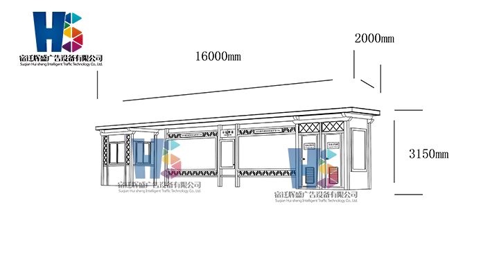 產(chǎn)品外觀 / PRODUCT DETAILS 產(chǎn)品信息 / PRODUCT INFO 【產(chǎn)品名稱】:新款候車亭HS54 【產(chǎn)品系列】:新款候車亭 【產(chǎn)品型號】:HS54 【產(chǎn)品規(guī)格】:長16000mm 寬2000mm 高3150mm 【產(chǎn)品材質(zhì)】:熱鍍鋅鋼板 【使用年限】:10-15年 【詳情致電】:181-5189-0417、157-5170-8886 備注:產(chǎn)品可根據(jù)用戶需求選用材質(zhì)、顏色及配件,個性化定制。 1、表面采用靜電噴塑(氟碳烤漆/搪瓷處理) 2、頂棚采用100*100*1.5mm、100*150*2mm鍍鋅管,3mm鍍鋅板激光切割件、1.5mm鍍鋅板焊接骨架,鋪1mm鍍鋅板(10mm陽光板) 3、立柱采用150*150*3mm鍍鋅管 4、箱體采用1.5mm鍍鋅板折彎焊接成型,門框采用全玻鋁合金型材,視窗采用6mm鋼化玻璃 5、照明電器采用LED燈粒 產(chǎn)品尺寸 / PRODUCT SIZE 關(guān)于輝盛 / 為社會分擔責任,為客戶創(chuàng)造價值 宿遷輝盛廣告設(shè)備有限公司是一家集設(shè)計、研發(fā)、生產(chǎn)為一體的城市公共設(shè)施生產(chǎn)型企業(yè)。主要產(chǎn)品有:候車公交亭、公交站臺、閱報欄、路名牌、垃圾箱、燈箱等市政設(shè)施系列產(chǎn)品和工程配套設(shè)施系列產(chǎn)品,現(xiàn)有高級技師30多人,高級職稱設(shè)計人員10人,是一家具有自主開發(fā)和設(shè)計能力的以公交亭、智能公交為主導(dǎo)的綜合性城市公共設(shè)施制造企業(yè)。為了進一步改善生產(chǎn)工藝,提高產(chǎn)品質(zhì)量,公司引進了先進生產(chǎn)設(shè)備,包括立臥式加工中心,工業(yè)涂裝流水線,CNC車床,線切割機,大型數(shù)控板機,數(shù)控折邊機,數(shù)控沖孔機床,大型折彎機等。公司還專門成立了產(chǎn)品研發(fā)部門,現(xiàn)每年自主開發(fā)或應(yīng)客戶要求設(shè)計推出多款新產(chǎn)品。 榮譽資質(zhì) / ENTERPRISE HONOR
