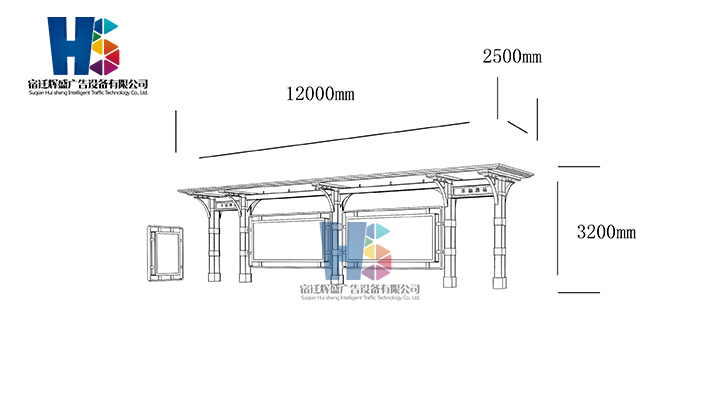 產(chǎn)品外觀 / PRODUCT DETAILS 產(chǎn)品信息 / PRODUCT INFO 【產(chǎn)品名稱】:新款候車亭HS41 【產(chǎn)品系列】:新款候車亭 【產(chǎn)品型號(hào)】:HS41 【產(chǎn)品規(guī)格】:長12000mm 寬2500mm 高3200mm 【產(chǎn)品材質(zhì)】:熱鍍鋅鋼板 【使用年限】:10-15年 【詳情致電】:181-5189-0417、157-5170-8886 備注:產(chǎn)品可根據(jù)用戶需求選用材質(zhì)、顏色及配件,個(gè)性化定制。 1、表面采用靜電噴塑(氟碳烤漆/搪瓷處理) 2、頂棚采用100*100*1.5mm、100*150*2mm鍍鋅管,3mm鍍鋅板激光切割件、1.5mm鍍鋅板焊接骨架,鋪1mm鍍鋅板(10mm陽光板) 3、立柱采用150*150*3mm鍍鋅管 4、箱體采用1.5mm鍍鋅板折彎焊接成型,門框采用全玻鋁合金型材,視窗采用6mm鋼化玻璃 5、照明電器采用LED燈粒 產(chǎn)品尺寸 / PRODUCT SIZE 關(guān)于輝盛 / 為社會(huì)分擔(dān)責(zé)任,為客戶創(chuàng)造價(jià)值 宿遷輝盛廣告設(shè)備有限公司是一家集設(shè)計(jì)、研發(fā)、生產(chǎn)為一體的城市公共設(shè)施生產(chǎn)型企業(yè)。主要產(chǎn)品有:候車公交亭、公交站臺(tái)、閱報(bào)欄、路名牌、垃圾箱、燈箱等市政設(shè)施系列產(chǎn)品和工程配套設(shè)施系列產(chǎn)品,現(xiàn)有高級技師30多人,高級職稱設(shè)計(jì)人員10人,是一家具有自主開發(fā)和設(shè)計(jì)能力的以公交亭、智能公交為主導(dǎo)的綜合性城市公共設(shè)施制造企業(yè)。為了進(jìn)一步改善生產(chǎn)工藝,提高產(chǎn)品質(zhì)量,公司引進(jìn)了先進(jìn)生產(chǎn)設(shè)備,包括立臥式加工中心,工業(yè)涂裝流水線,CNC車床,線切割機(jī),大型數(shù)控板機(jī),數(shù)控折邊機(jī),數(shù)控沖孔機(jī)床,大型折彎機(jī)等。公司還專門成立了產(chǎn)品研發(fā)部門,現(xiàn)每年自主開發(fā)或應(yīng)客戶要求設(shè)計(jì)推出多款新產(chǎn)品。 榮譽(yù)資質(zhì) / ENTERPRISE HONOR