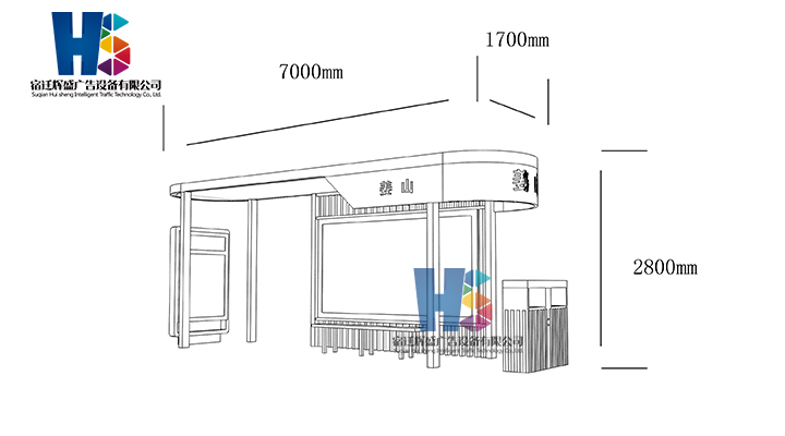 產(chǎn)品外觀 / PRODUCT DETAILS 產(chǎn)品信息 / PRODUCT INFO 【產(chǎn)品名稱】:新款候車亭HS13 【產(chǎn)品系列】:新款候車亭 【產(chǎn)品型號】:HS13 【產(chǎn)品規(guī)格】:長7000mm 寬1700mm 高2800mm 【產(chǎn)品材質(zhì)】:熱鍍鋅鋼板 【使用年限】:10-15年 【詳情致電】:181-5189-0417、157-5170-8886 備注:產(chǎn)品可根據(jù)用戶需求選用材質(zhì)、顏色及配件,個性化定制。 1、表面采用靜電噴塑(氟碳烤漆/搪瓷處理) 2、頂棚采用100*100*1.5mm、100*150*2mm鍍鋅管,3mm鍍鋅板激光切割件、1.5mm鍍鋅板焊接骨架,鋪1mm鍍鋅板(10mm陽光板) 3、立柱采用150*150*3mm鍍鋅管 4、箱體采用1.5mm鍍鋅板折彎焊接成型,門框采用全玻鋁合金型材,視窗采用6mm鋼化玻璃 5、照明電器采用LED燈粒 產(chǎn)品尺寸 / PRODUCT SIZE 關(guān)于輝盛 / 為社會分擔(dān)責(zé)任,為客戶創(chuàng)造價值 宿遷輝盛廣告設(shè)備有限公司是一家集設(shè)計、研發(fā)、生產(chǎn)為一體的城市公共設(shè)施生產(chǎn)型企業(yè)。主要產(chǎn)品有:候車公交亭、公交站臺、閱報欄、路名牌、垃圾箱、燈箱等市政設(shè)施系列產(chǎn)品和工程配套設(shè)施系列產(chǎn)品,現(xiàn)有高級技師30多人,高級職稱設(shè)計人員10人,是一家具有自主開發(fā)和設(shè)計能力的以公交亭、智能公交為主導(dǎo)的綜合性城市公共設(shè)施制造企業(yè)。為了進(jìn)一步改善生產(chǎn)工藝,提高產(chǎn)品質(zhì)量,公司引進(jìn)了先進(jìn)生產(chǎn)設(shè)備,包括立臥式加工中心,工業(yè)涂裝流水線,CNC車床,線切割機(jī),大型數(shù)控板機(jī),數(shù)控折邊機(jī),數(shù)控沖孔機(jī)床,大型折彎機(jī)等。公司還專門成立了產(chǎn)品研發(fā)部門,現(xiàn)每年自主開發(fā)或應(yīng)客戶要求設(shè)計推出多款新產(chǎn)品。 榮譽資質(zhì) / ENTERPRISE HONOR