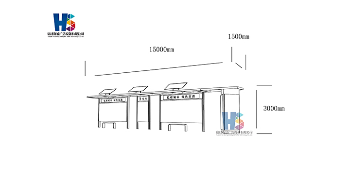 產(chǎn)品外觀 / PRODUCT DETAILS 產(chǎn)品信息 / PRODUCT INFO 【產(chǎn)品名稱】:新款候車亭HS3 【產(chǎn)品系列】:新款候車亭 【產(chǎn)品型號(hào)】:HS3 【產(chǎn)品規(guī)格】:長(zhǎng)15000mm 寬1500mm 高3000mm 【產(chǎn)品材質(zhì)】:熱鍍鋅鋼板 【使用年限】:10-15年 【詳情致電】:181-5189-0417、157-5170-8886 備注:產(chǎn)品可根據(jù)用戶需求選用材質(zhì)、顏色及配件,個(gè)性化定制。 1、表面采用靜電噴塑(氟碳烤漆/搪瓷處理) 2、頂棚采用100*100*1.5mm、100*150*2mm鍍鋅管,3mm鍍鋅板激光切割件、1.5mm鍍鋅板焊接骨架,鋪1mm鍍鋅板(10mm陽(yáng)光板) 3、立柱采用150*150*3mm鍍鋅管 4、箱體采用1.5mm鍍鋅板折彎焊接成型,門框采用全玻鋁合金型材,視窗采用6mm鋼化玻璃 5、照明電器采用LED燈粒 產(chǎn)品尺寸 / PRODUCT SIZE 關(guān)于輝盛 / 為社會(huì)分擔(dān)責(zé)任,為客戶創(chuàng)造價(jià)值 宿遷輝盛廣告設(shè)備有限公司是一家集設(shè)計(jì)、研發(fā)、生產(chǎn)為一體的城市公共設(shè)施生產(chǎn)型企業(yè)。主要產(chǎn)品有:候車公交亭、公交站臺(tái)、閱報(bào)欄、路名牌、垃圾箱、燈箱等市政設(shè)施系列產(chǎn)品和工程配套設(shè)施系列產(chǎn)品,現(xiàn)有高級(jí)技師30多人,高級(jí)職稱設(shè)計(jì)人員10人,是一家具有自主開發(fā)和設(shè)計(jì)能力的以公交亭、智能公交為主導(dǎo)的綜合性城市公共設(shè)施制造企業(yè)。為了進(jìn)一步改善生產(chǎn)工藝,提高產(chǎn)品質(zhì)量,公司引進(jìn)了先進(jìn)生產(chǎn)設(shè)備,包括立臥式加工中心,工業(yè)涂裝流水線,CNC車床,線切割機(jī),大型數(shù)控板機(jī),數(shù)控折邊機(jī),數(shù)控沖孔機(jī)床,大型折彎?rùn)C(jī)等。公司還專門成立了產(chǎn)品研發(fā)部門,現(xiàn)每年自主開發(fā)或應(yīng)客戶要求設(shè)計(jì)推出多款新產(chǎn)品。 榮譽(yù)資質(zhì) / ENTERPRISE HONOR