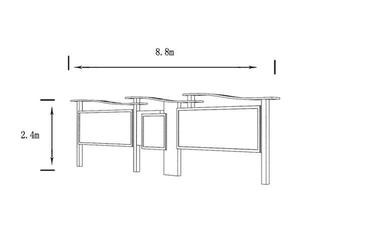 產(chǎn)品外觀 / PRODUCT DETAILS 產(chǎn)品信息 / PRODUCT INFO 【產(chǎn)品名稱】:宣傳欄XCL11-1 【產(chǎn)品系列】:宣傳欄 【產(chǎn)品型號】:XCL11-1 【產(chǎn)品規(guī)格】:長8800mm高2400mm 【產(chǎn)品材質(zhì)】:熱鍍鋅鋼板 【使用年限】:10-15年 【詳情致電】:181-5189-0417、157-5170-8886 備注:產(chǎn)品可根據(jù)用戶需求選用材質(zhì)、顏色及配件,個性化定制。 1、表面采用靜電噴塑(氟碳烤漆/搪瓷處理) 2、頂棚采用100*100*1.5mm、100*150*2mm鍍鋅管,3mm鍍鋅板激光切割件、1.5mm鍍鋅板焊接骨架,鋪1mm鍍鋅板(10mm陽光板) 3、立柱采用150*150*3mm鍍鋅管 4、箱體采用1.5mm鍍鋅板折彎焊接成型,門框采用全玻鋁合金型材,視窗采用6mm鋼化玻璃 5、照明電器采用LED燈粒 產(chǎn)品尺寸 / PRODUCT SIZE 關(guān)于輝盛 / 為社會分擔(dān)責(zé)任,為客戶創(chuàng)造價值 宿遷輝盛廣告設(shè)備有限公司是一家集設(shè)計、研發(fā)、生產(chǎn)為一體的城市公共設(shè)施生產(chǎn)型企業(yè)。主要產(chǎn)品有:候車公交亭、公交站臺、閱報欄、路名牌、垃圾箱、燈箱等市政設(shè)施系列產(chǎn)品和工程配套設(shè)施系列產(chǎn)品,現(xiàn)有高級技師30多人,高級職稱設(shè)計人員10人,是一家具有自主開發(fā)和設(shè)計能力的以公交亭、智能公交為主導(dǎo)的綜合性城市公共設(shè)施制造企業(yè)。為了進(jìn)一步改善生產(chǎn)工藝,提高產(chǎn)品質(zhì)量,公司引進(jìn)了先進(jìn)生產(chǎn)設(shè)備,包括立臥式加工中心,工業(yè)涂裝流水線,CNC車床,線切割機(jī),大型數(shù)控板機(jī),數(shù)控折邊機(jī),數(shù)控沖孔機(jī)床,大型折彎機(jī)等。公司還專門成立了產(chǎn)品研發(fā)部門,現(xiàn)每年自主開發(fā)或應(yīng)客戶要求設(shè)計推出多款新產(chǎn)品。 榮譽(yù)資質(zhì) / ENTERPRISE HONOR